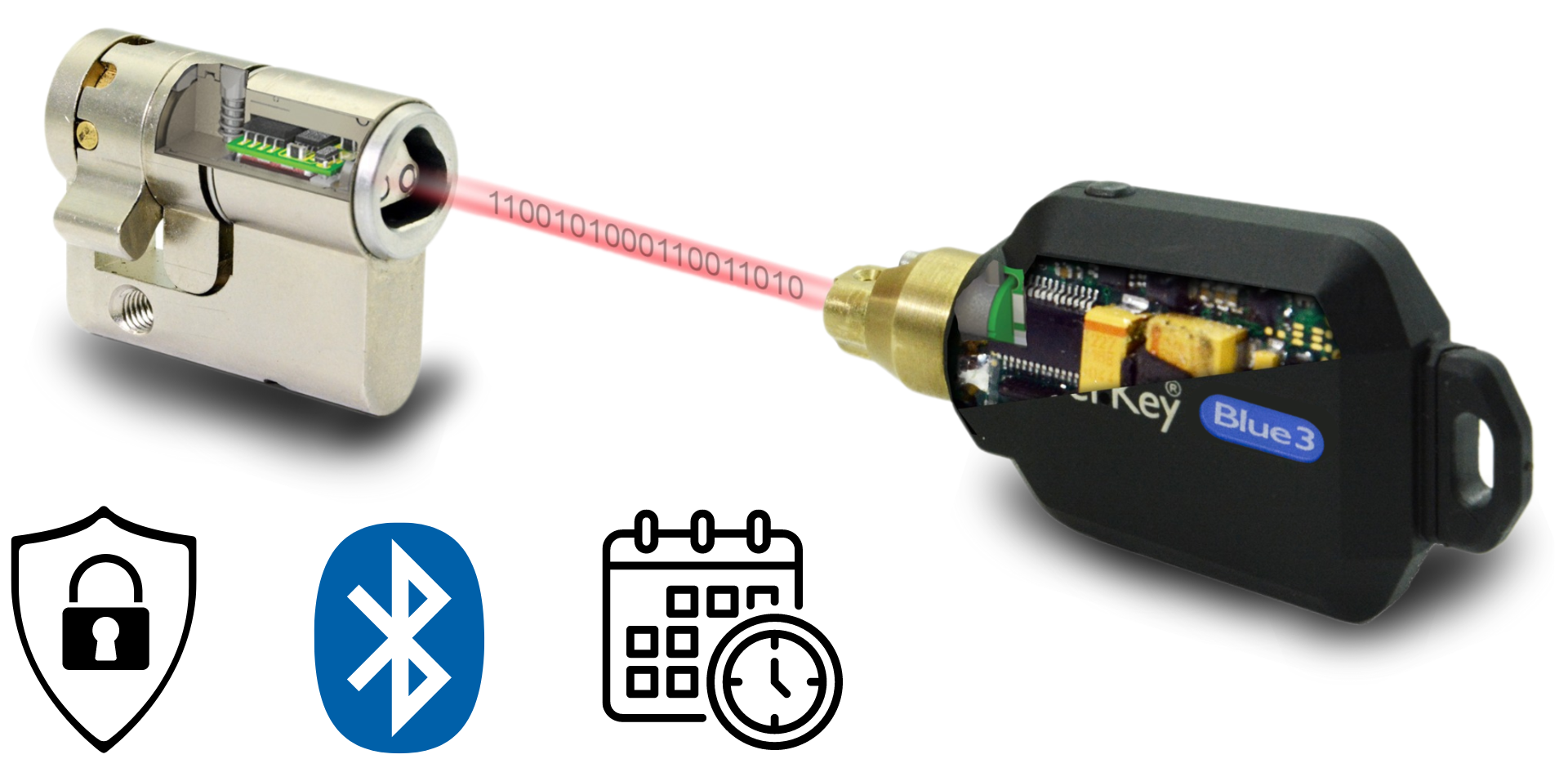 La clé CyberKey Blue3 est conçue pour ouvrir toutes les serrures CyberLock (cylindres, cadenas,...). Sa batterie intégrée permet d’alimenter le circuit électronique des cylindres. Grâce au Bluetooth, l’utilisateur peut mettre à jour ses droits d’accès personnalisés à l’aide d’un smartphone. La CyberKey contient les codes d’accès chiffrés, les serrures accessibles, les plannings d'autorisations et la période de validité des droits d’accès.
